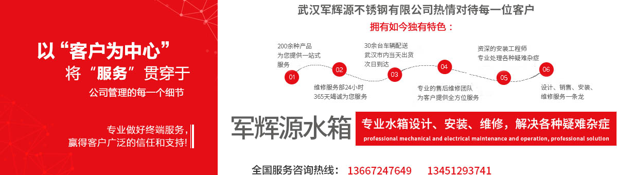 武漢軍輝源不銹鋼有限公司是華中地區(qū)專業(yè)生產(chǎn)不銹鋼水箱的環(huán)保企業(yè),公司集不銹鋼水箱開(kāi)發(fā)設(shè)計(jì)、生產(chǎn)、銷售、維修、售后服務(wù)為一體。